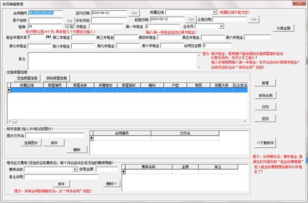 系统包含房屋租赁合同管理、租金管理、押金管理、统计报表、系统管理、房屋管理、业主信息、客户管理、租金提醒、合同提示等功能于一体的房屋租赁管理单位日常工作解决方案,实现了出租、收款、统计、提醒等功能的完美结合支持年租金递增管理功能。