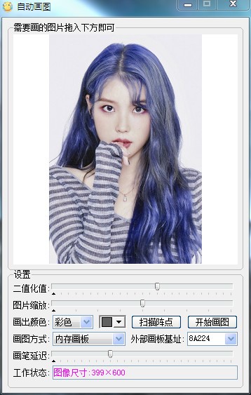 自动画图是网友自制的一个简单易用的电脑绘图工具,支持win7、win10操作系统,使用的时候需要将图片导入后然后点击软件中的扫描阵点,等扫描完毕后才可以开始画,而且该工具不占用鼠标,画的过程中可以把图片缩放,支持单色和彩色,同时也提供了预览功能,可对比原图和二值化后的图。