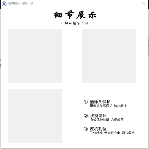 细节图一键生成软件适用于电商行业,我们一般看到的商品图片上都会详细的描述物品的具体信息,让购买者可以直观地查看到商品全貌,使用这款软件就能够帮助电商用户一键生成商品的细节图,从多个方面描述该商品,非常方便更好地像客户展示,使用起来非常非常方便,只需拖动即可生成。