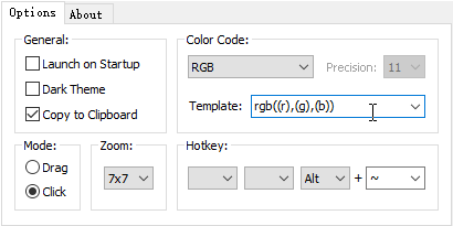 nstant Eyedropper目前支持下列类型的颜色代码:HTML、Hex、Delphi Hex、VB Hex、RGB、HSB;