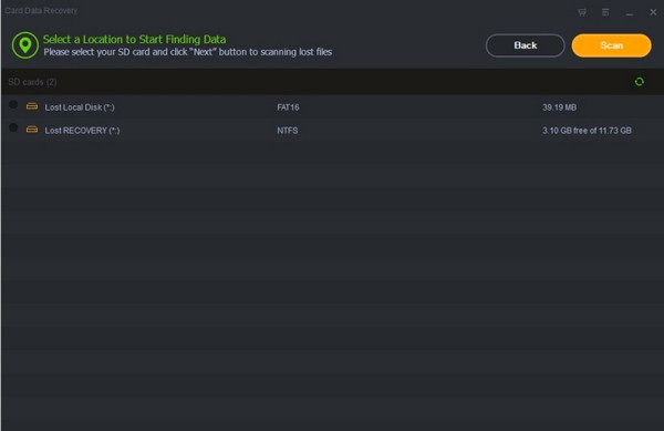 将您的SD卡连接到计算机;启动Shining Card Data Recovery软件,单击“开始”按钮,与计算机相关的所有分区和驱动程序将显示在界面上。选择丢失文件的SD卡,然后单击“扫描”按钮以搜索所有已删除,丢失和现有的文件。