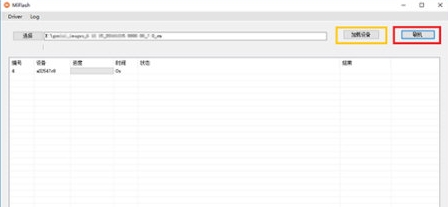 8:点击黄色圈选部分加载设备,刷机程序会自动识别手机,点击红色圈选部分刷机开始刷机(有BL锁机型默认会选择“全部删除并LOCK”,没有BL锁机型需要手动选择“全部删除”)
