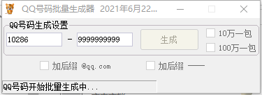 QQ号码批量生成器是针对QQ制作的辅助工具,为用户带来了批量生产qq号的强大功能,如果需要大量的qq账号就可以通过这款软件进行申请,帮助用户快速获得大量的qq账号,很适合喜欢玩qq游戏的朋友们使用,用这些账号来玩游戏就不怕输光积分了,界面简洁,一键即可生成qq号。