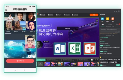 支持音视频、各类课件、图文等素材支持桌面分享、软件直播等模式。