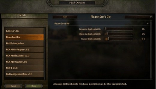 骑马与砍杀2请不要死MOD专为喜欢骑马与砍杀2的玩家们打造,是一个很非常实用的功能型mod,补丁的作者在游戏中制作添加了一个不会死亡的功能,玩家打上这个补丁之后就可以尽情地体验杀戮的乐趣,而不用担心自己的角色会死亡,有效地防止英雄在战斗中因为受伤而死亡的情况出现。