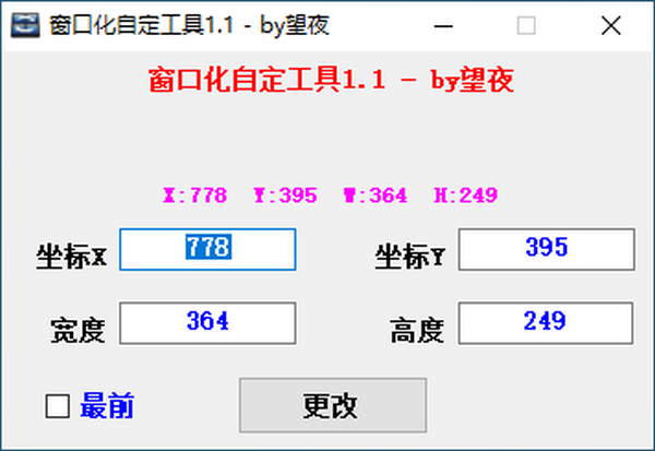 软件界面很直观,用户可以直接将想要的窗口大小数据输入进去并点击更改,就能够实现窗口的调节,非常方便将窗口的高度和宽度按照用户的需求拉伸,从而为用户带来更好的浏览体验。