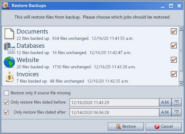 Mirror Backup可以维护每个文件的历史记录。这很非常重要的,因为如果文件已损坏,则在进行一次或多次备份之前可能不会注意到它。此功能可防止损坏的文件覆盖唯一的备份。您将能够从历史记录中恢复文件的任何版本,或将整个文件集回滚到特定日期和时间。
