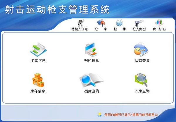 射击运动枪支管理系统用户界面设计的简约美观,极易上手,而且体积小巧,不占内存,内置丰富完整的射击枪队枪支管理功能模块,包含持有者信息、仓库、枪支类型、枪种、代表队、出库、归还等,还有归还到期预警,支持数据与execel的导出与导入,大大提升了管理的科学规范性。
