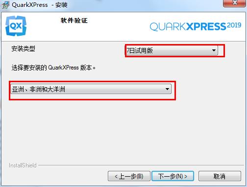 3、选择安装类型“7日试用版”,安装的版本为“亚洲、非洲和大洋洲”