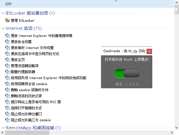 其实电脑中有各种上帝模式功能,只是被系统隐藏了,这个Godmode就是非常多的人都在使用人用的一款上帝模式开关,安装后打开软件,软件会自动打开windows所有的自带程序,您可以查看操作系统所有设置的控制面板,选择自己需要的功能,快速对电脑进行管理和优化,让系统运行的更加流畅。