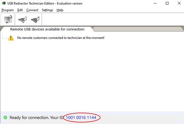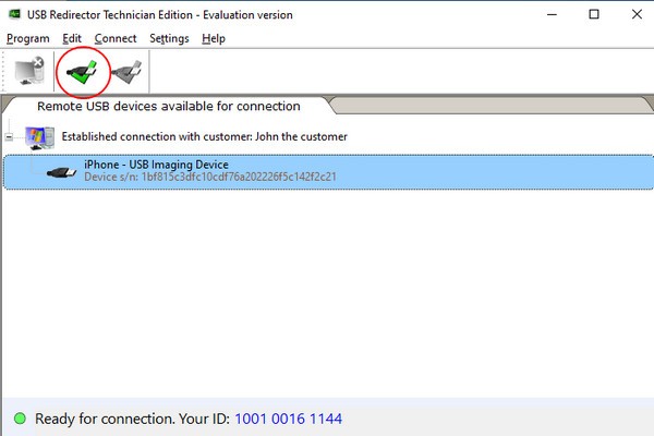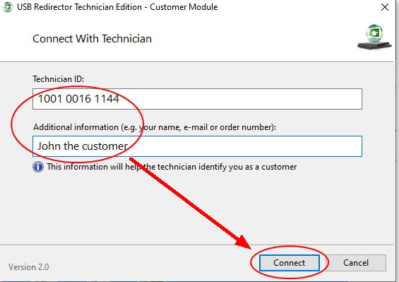 客户必须在其计算机上启动模块并按照提供的说明进行操作:输入技术人员 ID,单击连接按钮并等待连接成功,然后将其 USB 设备连接到 USB 端口。
