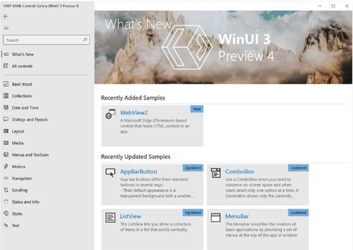 示例:要使用 WinUI 3 控件和功能的运行,你可以从 GitHub 克隆和构建 WinUI 3 Controls Gallery 应用程序,或从微软商店下载 WinUI 3 Controls Gallery。
