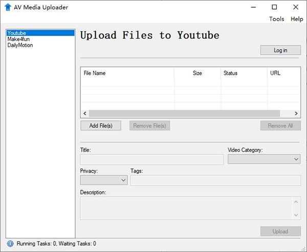 AV媒体上传程序是一个多任务的工具,让用户直接把文件上传到其它平台