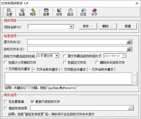 同步的逻辑是比较源文件和目标文件的最后修改时间,例如,如果选择小于源文件,则最后修改时间小于源文件的目标文件将被更新,如果选择全部,则所有目标文件将被更新;