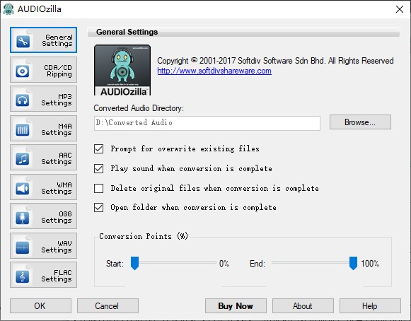 可以为音频的起点和终点设置选项。输出音频格式质量,例如比特率,通道,样本大小;保留/删除音频标签信息。