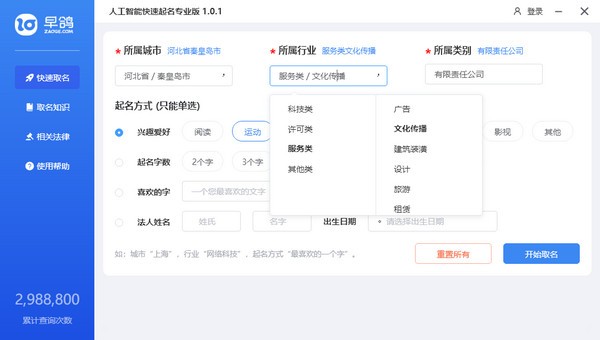 提供多元化的取名方式供用于自行选择,我们提供兴趣爱好、起名字数、喜欢的字、法人姓名+出生日期4种不同的取名方式,匹配不同对应的取名结果。