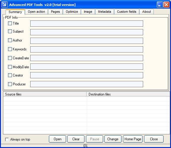高级PDF工具可以编辑PDF描述和属性的各种内容。它可以编辑PDF描述,例如,图块,主题,作者,关键字,创建时间,修改时间,创建者和制作者。它还可以编辑PDF属性,如OpenAction,页面视图,图像压缩和元数据内容。