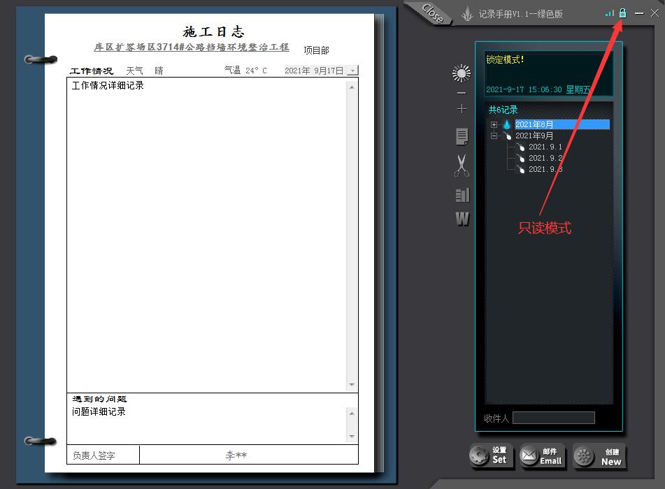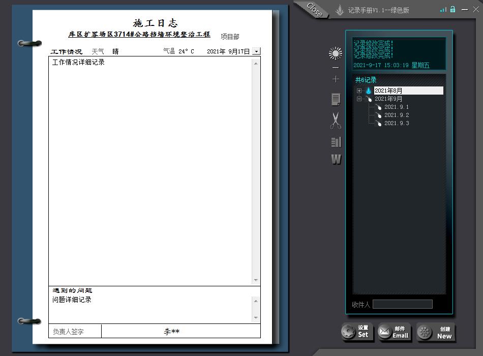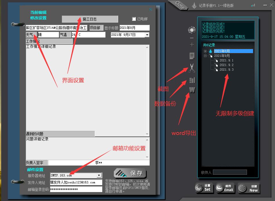 记录手册(施工日志)是非常好用的非常多的人都在使用人用的一款软件,软件有着非常多的人都在使用的功能,包含了施工日志、工程管理、个人笔记、工程汇报、每日汇报、日记本,记账等多种内容,并且软件还支持界面配置、邮件代发、一键截图、数据保存、无限制分级创建等多种功能的日志软件,非常的非常实用,感兴趣的用户快来下载使用吧。