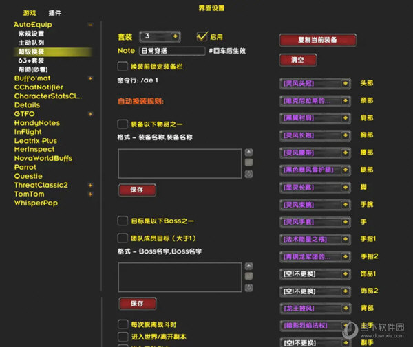 这个AutoEquip插件对于喜欢玩魔兽的玩家们来说应该是个非常非常实用的工具,它可以帮助您自动换装,在创建队列的时候自行整理装备,一键脱装、一键换装,还能自定规则患者,同时自带了装备栏和Buff提醒框架,角色属性窗口也能快捷换装,感兴趣的玩家一定要试试哦!