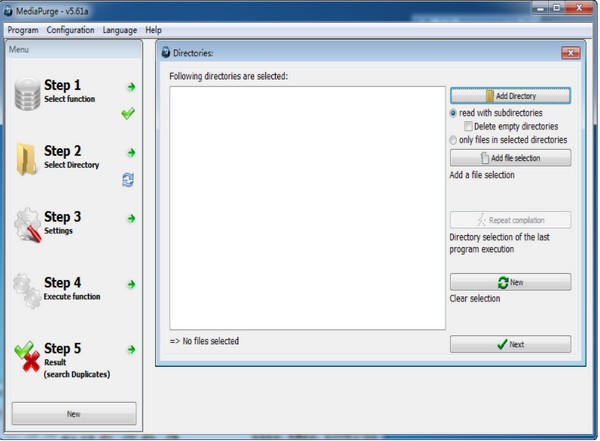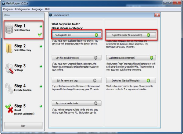 首先是在 MediaPurge 中设置相似音频的查找方面,在「Step 1」中选择「Find duplicate files」然后再选择「Duplicates (similar file information)」,之后会弹出一个新窗口,在里面设定要查找的目录范围。