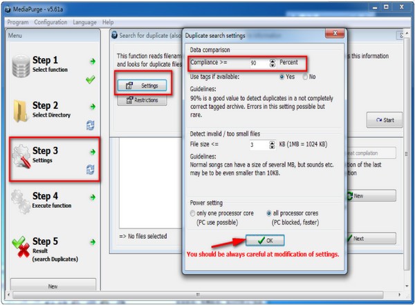 接着会来到「Step 3」设置,点击「Settings」按钮,在「Compliance」处设置相似度百分比,点击「OK」后再点「Start」就会开始进行查找。