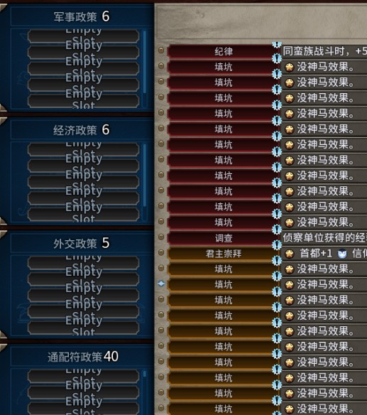 文明6风云变幻更多政策插槽MOD是针对文明6风云变幻打造的功能型mod,可以为玩家们带来更多的插槽效果,补丁是由“538108”制作并分享的,玩家使用之后就可以在游戏中获得更多的政策插槽了,其中包括军事插槽+5,经济插槽+5,外交插槽+5,通用插槽+40,以及填坑卡56张。
