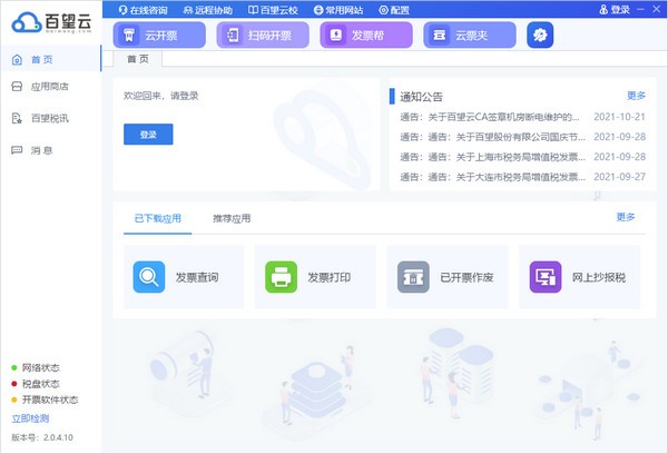 百望云桌面是针对电子发票打造的服务云平台,具备了许多发票相关的管理功能,软件的功能十分强大,对发票的数量没有任何限制,能够帮助用户轻松实现数据集中管理,并提供了发票在线打印的功能,为开票的工作人员减轻了许多负担,支持一键获取所有的发票历史信息,享受便捷的服务。