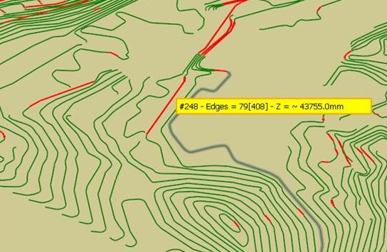 4、图中红的状态区均为断线之间的自动修复连接。插件作者fredo6设计toposhaper会在合理的范围内对所导入的等高线曲度和断点进行优化修复 在状态栏中也会有相关的提示。