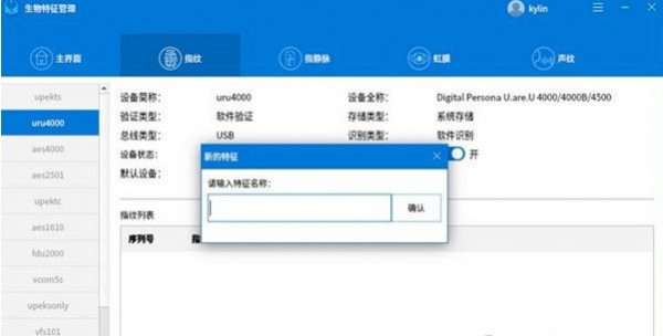 这里,我们以指纹为例,选中指纹栏,在左边选择我们的设备后,点击录入指纹:
