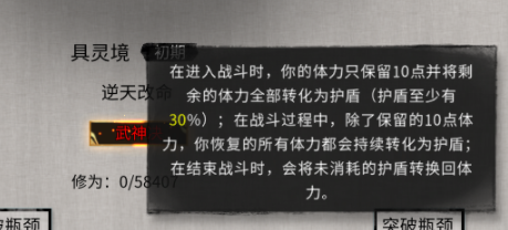 在进入战斗时,你的体力只保留10点并将剩余的体力全部转化为护盾(护盾至少有30%);