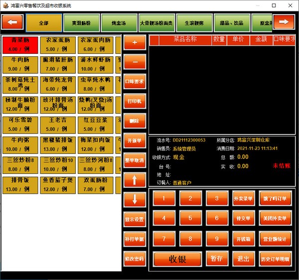 超市、连锁店、餐饮店等门店销售场景都适用于这款鸿富兴零售餐饮及超市收银系统,其界面设计的简约易用,布局人性化好操作,功能涵盖订单管理、菜品管理、前台收银等,支持多种收款模式以及各种POS机器,打印小票也能够灵活定制,满足用户的个性化需求。