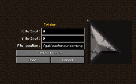 2、要修改你的光标,你需要添加一个资源包,把你想用的光标以PNG形式保存在assets/minecraft/textures/gui/内(该路径可通过“cursorLocation”修改),并在配置内添加热点位置;
