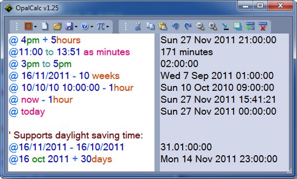 OpalCalc也可以处理日期和时间,如果您在开头放一个符号。有关更多信息,请参阅本页底部的主表,但这里有一些示例可以帮助您入门: