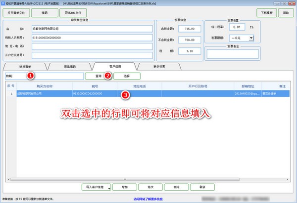 如果购买方以前开过发票则在“客户信息”选择卡搜索框内输入购方名称部分字搜索,在搜出的单位名称上双击即可将对应信息填入。