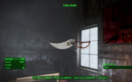辐射4夜刀眼镜蛇MOD是一个简单的武器物品添加mod,可以为喜欢辐射4的玩家们带来更多的道具,补丁的作者将以HermSchneider经典电影为灵感的尖刺刀制作添加到了辐射4中,玩家使用之后就能在游戏中获得这款帅气的夜刀眼镜蛇,通过皮克曼画廊内桌子上的餐具就能找到它。