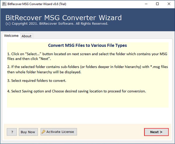 该软件带有易于使用的图形用户界面,因为当您启动 MSG 转换器时,其欢迎屏幕(第一个屏幕)提供了该软件的完整工作指南,以便简单地使用它。技术和非技术用户都可以非常方便地运行此批处理 Outlook 消息转换器工具。