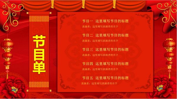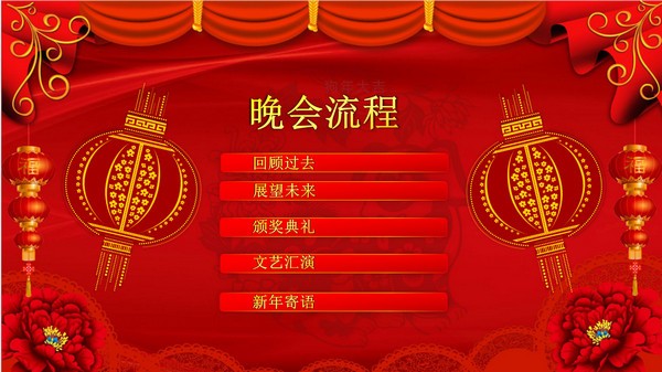 PPT模板采用了喜庆红色为主题色。PPT模板封面使用了红色帷幕、红灯笼、牡丹花,和剪纸虎年的老虎背景图片。中间放置金色公司迎新元旦联欢晚会PPT标题。界面风格大气喜庆。