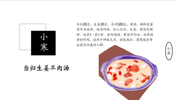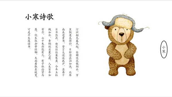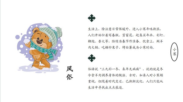 PowerPoint模板内容页,使用了雾凇插图、卡通小动物插图、小寒饮食插图等,搭配节气介绍文字排版。