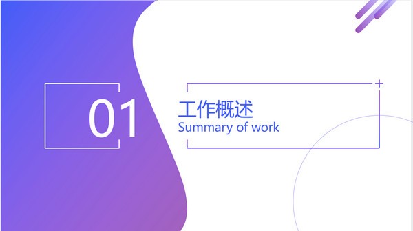 商务通用工作计划ppt模板,该模板采用了明亮的蓝紫渐变为主色调,风格简约直观,共有24页,主要包含了工作概述、情况分析、项目展示和未来计划几大模块,源文件为PPT格式,大家将模板下载后可以自行编辑修改,有需要的话可以自取。