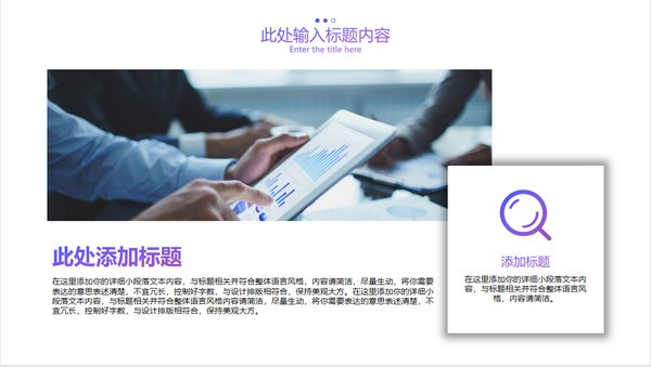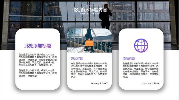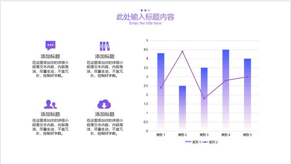 PowerPoint模板内容页,由22张蓝紫渐变幻灯片图表,搭配PPT文字排版。另外使用了商业建筑插图、职场办公插图、商务人物插图、办公桌面插图等装饰。