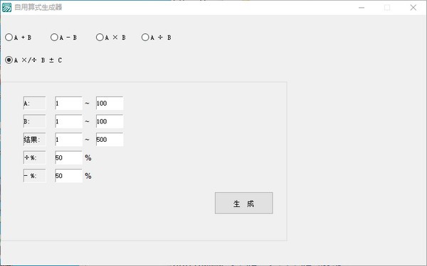 自用算式生成器,这是由吾爱网友用易语言编写的一个PC简易版口算算式生成工具,用来给小学生出四则运算题非常不错,使用方法非常简单,只需要运行软件后设置运算类型,然后输入数字范围就可以快速生成算式了,生成的题目为TXT格式,欢迎大家下载使用。