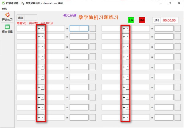 算数是学习数学的基础项目,想要更好地锻炼孩子们的算数能力可以使用小编带来的这款数学练习题生成器软件,这是一个很简单的算术题生成工具,可以对各种运算自动生成题目,随机出20道适合口算的数学题,让用户能够自主进行练习,软件还能快速判断答案的对错,有效提升算数成绩。