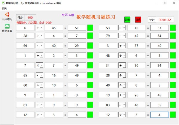 软件可以自动生成数学算数题,最多一次性生成20道题目,界面简洁直观,能够帮助用户在线练习数学运算能力,填写答案之后自动判断对错,很适合刚开始学习数学的小孩子们使用。