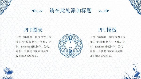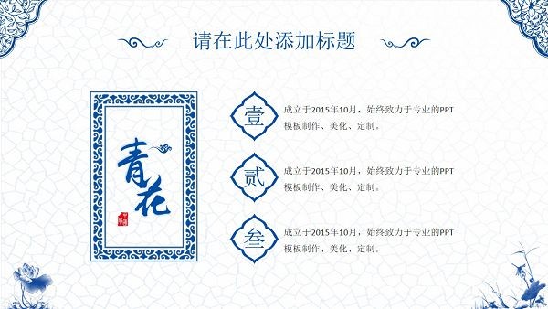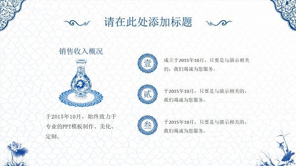 当年周杰伦的一曲青花瓷可谓是响遍大江南北,至今都在传唱,青花瓷作为中国瓷器的主流品种之一,其美无需赘述,大家都有目共睹,这款青花瓷PPT模板就是以为青花瓷图案为主题制作的一版PPT模板,具体样式可以参考下文图示,整体文艺素雅,喜欢的话可以下载套用。