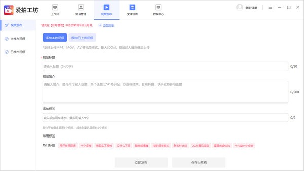 爱拍工坊支持多家自媒体账号一键发布,多家平台账号统一登录,非常方便管理
