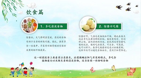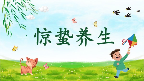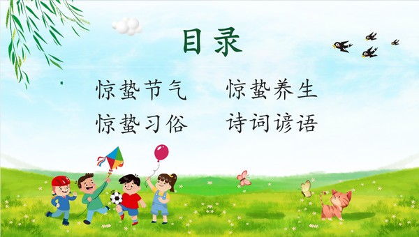 PPT模板采用了卡通风格设计制作。PPT封面使用了小朋友放风筝、南方归来的燕子、柳条、草地、梅花等背景元素。中间使用绿色字体填写二十四节气——惊蛰节气介绍PPT标题。界面卡通有趣。