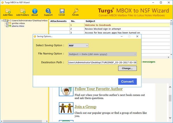 Turgs MBOX to NSF Wizard 允许您将完整的 MBOX 项目转换为 Lotus Notes 文件格式。只需 3 个简单的步骤,您就可以完全转换 MBOX 文件及其所有属性。它支持从任何服务器/电子邮件客户端(如Google Takeout、Mac Mail等)生成的所有 MBOX 文件。