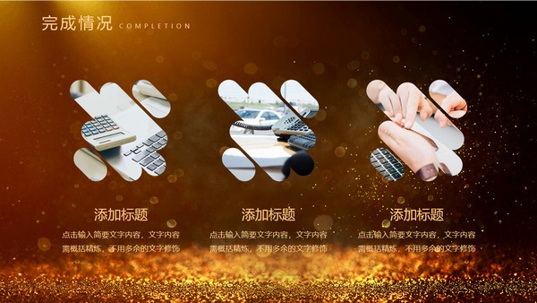 你的公司年会ppt做好了吗?如果还没开始做又来不及制作的话,就来直接下载这个金色大气公司年会盛典PPT模板套用吧!该模板以金色粉末作为背景图片,金光璀璨,一共有24页,具体样式可以参考下文模板预览,不管是作为年会盛典PPT还是颁奖大会PPT都非常不错!