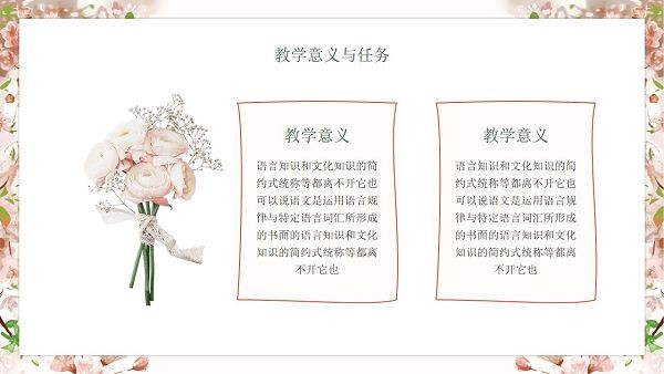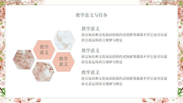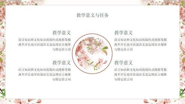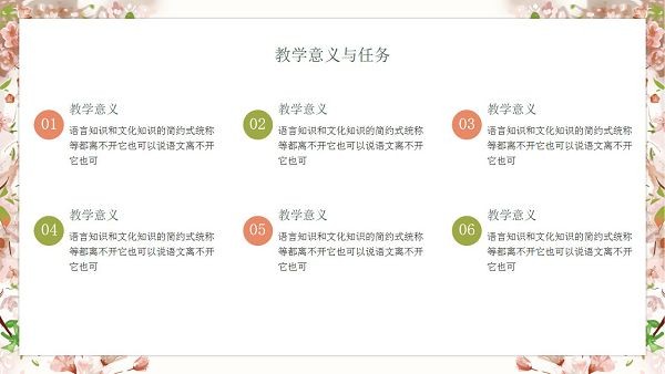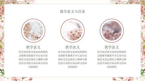 软件的页面排版看起来十分舒适规范,专门用来制作教学文档,是PPT演示的格式,图片素材都是很高清,用户直接下载就能在上面进行编辑修改了,色调为粉色的樱花图案。