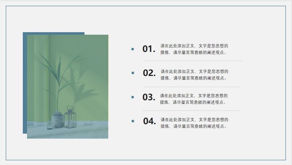 这款个人述职报告ppt模板风格比较清新淡雅,采用了房间的一角作为背景图片,你可以看到图片上阳光从窗户透过,洒向地板和墙壁,地面上的花瓶和花枝懒洋洋的沐浴在阳光之下,十分惬意,具体样式可以参考下文展示,喜欢的小伙伴们快来下载吧~